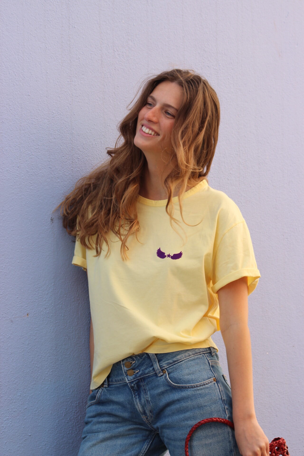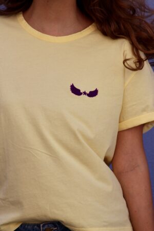 T-shirt mannga curta com com asas e estrela em veludo na cor roxo